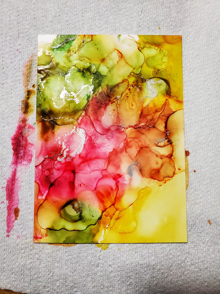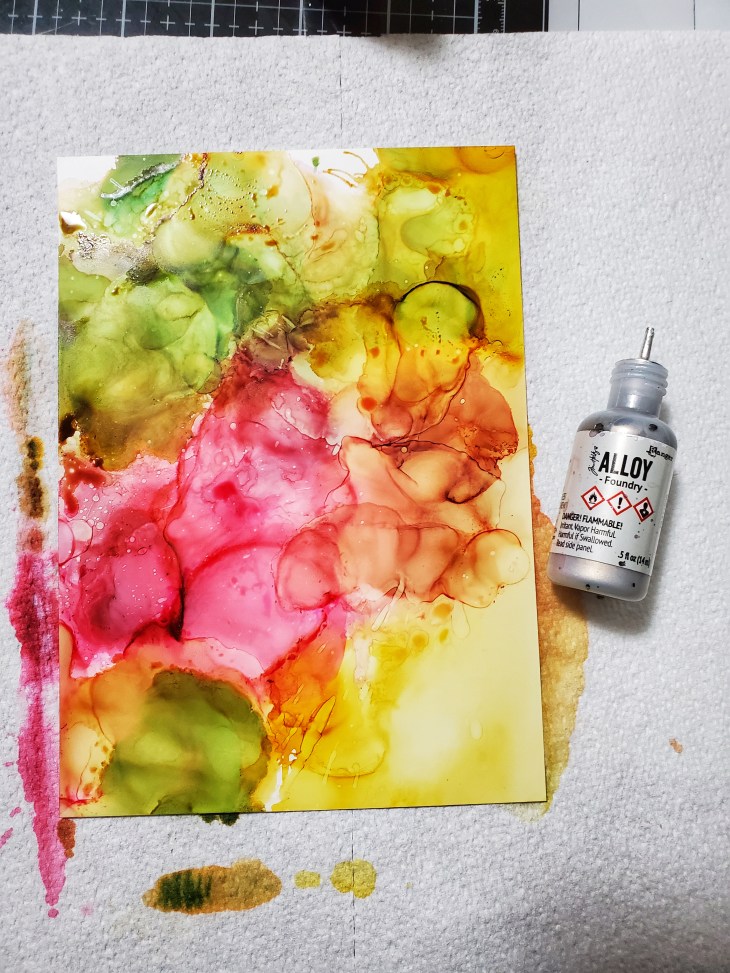 I start with heavystock Yupo paper. I used both TH air blower and a mini air compressor to move the ink . I have added a link for the mini air compressor that I had purchased from Amazon. I layered down some 91% isopropyl alchohol and dropped a mix of alchohol inks in the supply list below and started blending with the air compressor.