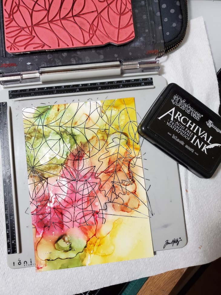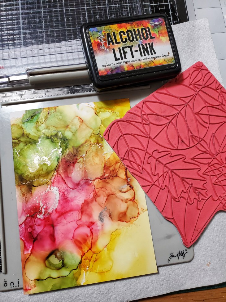 I put a piece of sticky grid onto my stamping platform and put the alchohol panel in place. Using the alchohol lift ink I started lifting off the Leafy leaves pattern. After each time I dabbed off the panel and I continued the same process until I could see the image really well.