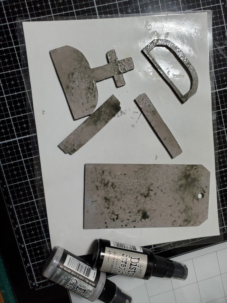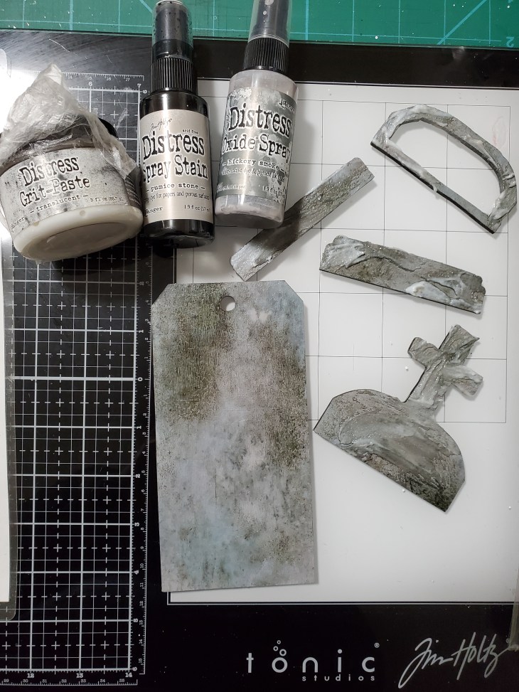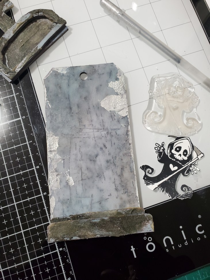 I used the small tombstone etcetera tag and covered it it will gesso. After it had dried I started layering on hickory smoke , pumice stone and a little bit of black soot. After a couple of coats I added on some translucent grit paste and some crypt grave paste.