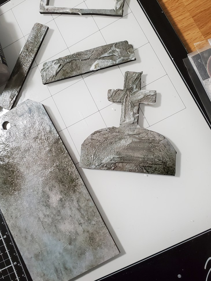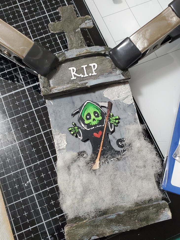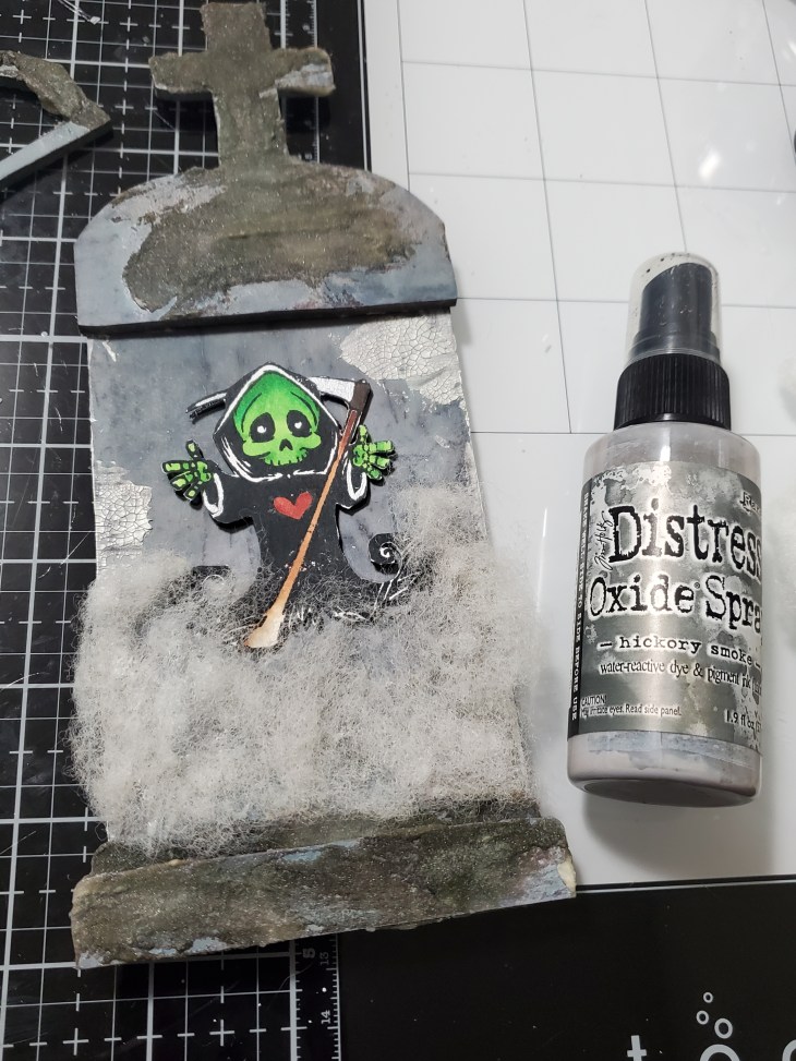 I colored the grim reaper with my distress inks and layrered it on top of the one I had stamped. I don’t think I really needed to stamp it onto the tag since the smoke was covering the bottom of the reaper. Always learning 🙂 I really wanted the illusion of smoke so got some batting and sprayed it with hickory smoke oxide spray glued it in place. For the R.I.P I wasn’t able to stamp on top of the paste so I ended up embossing it onto clear acetate and put it in between the cross and the top frame. For the sentiment I used silver cardstock and stamped it with archival ink and ran it through with Tim Holtz Foundery embossing folder.