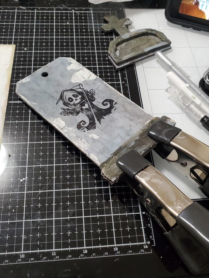 I added on some crackle paste for added texture. Using collage medium I started glueing pieces together and clamping them in place…yes I raided my husbands workshop 🙂 I stamped the grim reaper onto the tag only because I could cut all the cool little bits on the bottom of his robe. I stamped the image onto a piece of distress water color paperwork fussy cut it out.