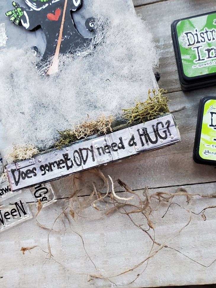 To finish of the tag I used some moss and glued it on random spots. I had so much fun putting this tag together. Hope you liked this project and if you give it a try please do share. Happy Halloween my crafty friends.