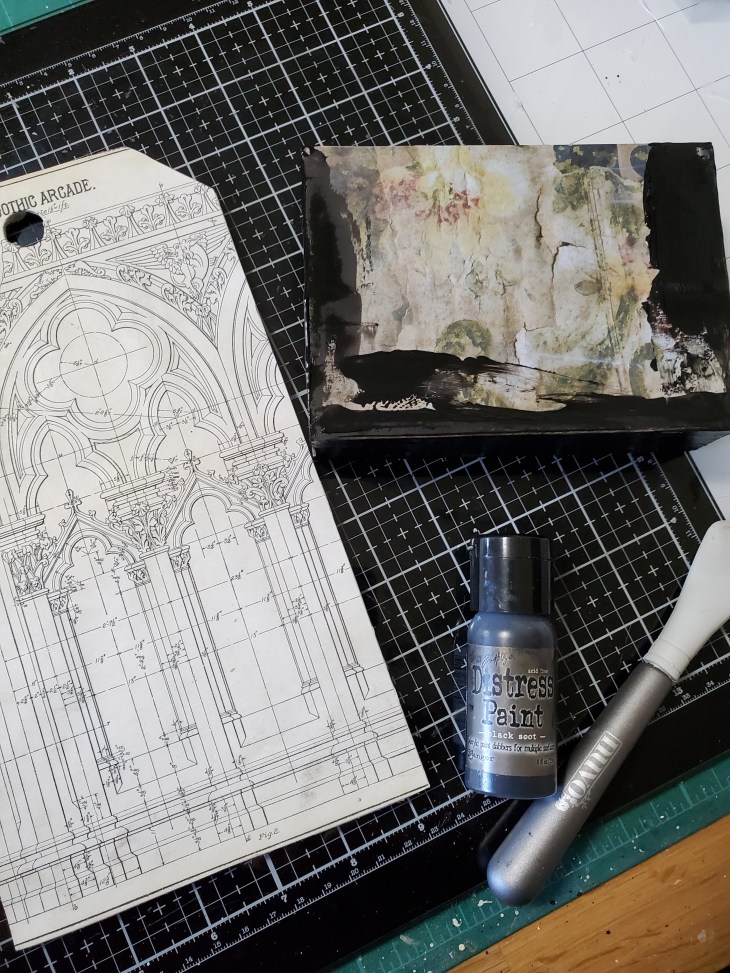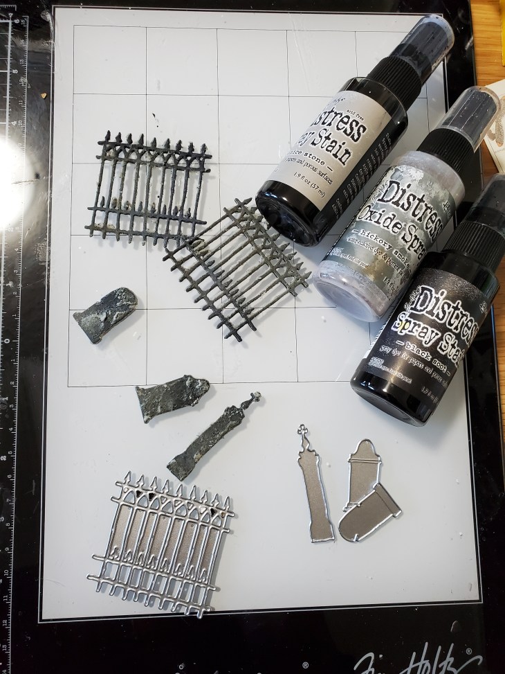 While the tag dried I started working on the accessories . I used distress watercolor cardstock and covered it with black soot, hickory smoke oxide and pumice stone spray and die cut the fence and tomb stones from the vaulted halloween series. I needed a base for the tag and decided on the larger vignette box which I covered with a piece of a backdrop on top and painted the sides with black soot paint . After the paint had dried I went over in sections with crackle paste and on the top I covered it with crypt grit paste and grave texture paste. Using the ranger tool I created a rough texture with it.