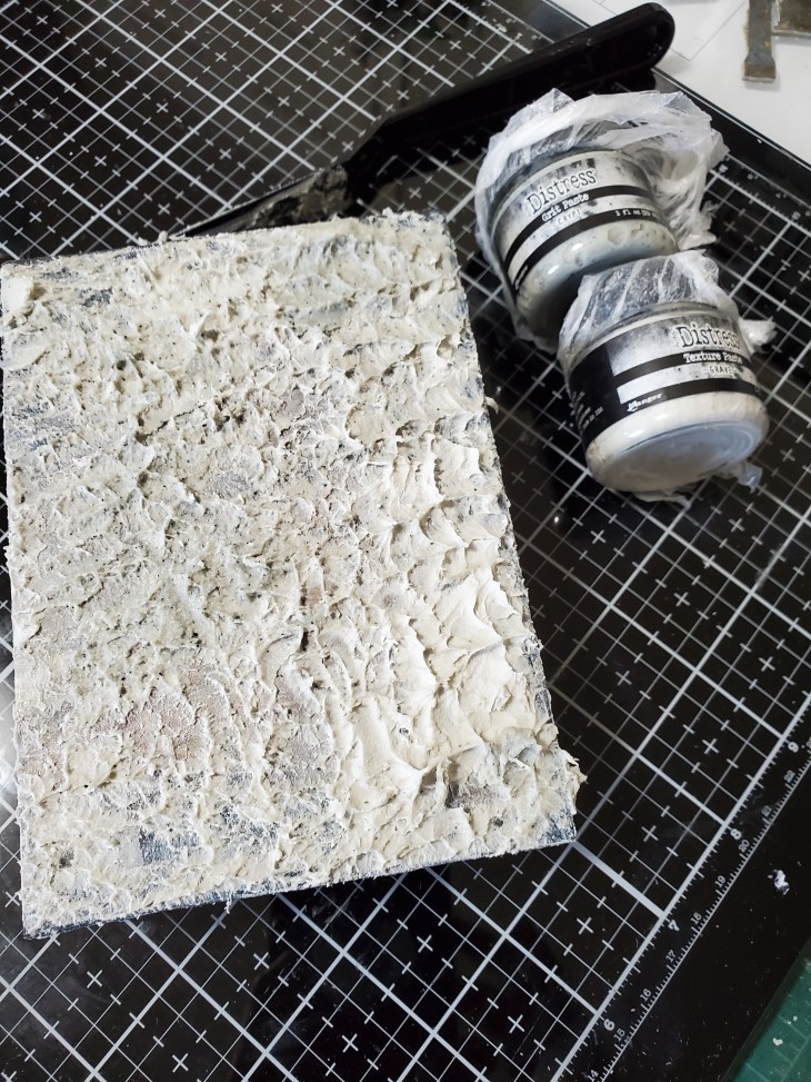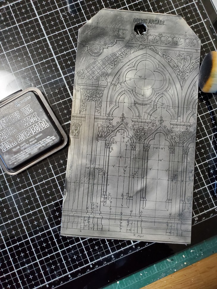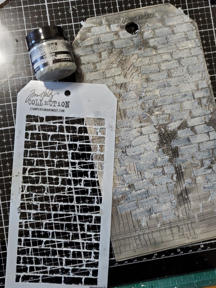 For this make I used a small ectcetera tag. Using Collage medium I covered the tag with a beautiful backdrop. Went over the panel with black soot distress ink and using the bricked stencil I covered the tag with crypt grit paste….just love the look and so awesome that SSS still has some in stock may need to stock up on some more 🙂