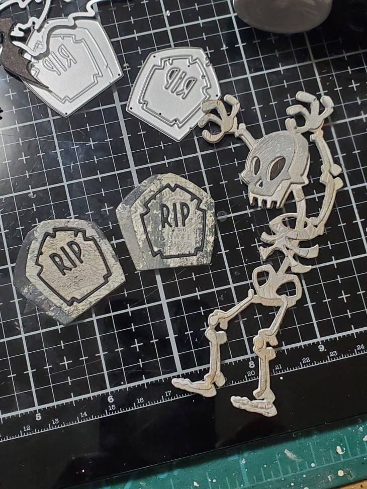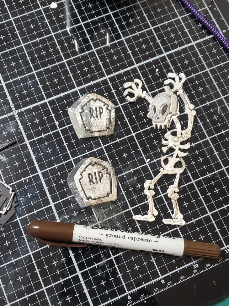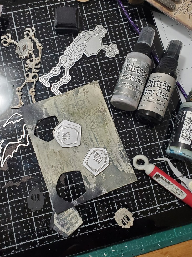For Mr Bones I used Distress woodgrain cardstock. Before die cutting I spread some crackle paste over small sections. I colored the cards stock with gathered twigs, pumice stone and hickory smoke. For the tombstones I had a background panel that I had colored with frayed burlap and hickory smoke oxide spray and pumice stone. I did cut the pieces out with black card stock as well to use for the inside border and R.I.P