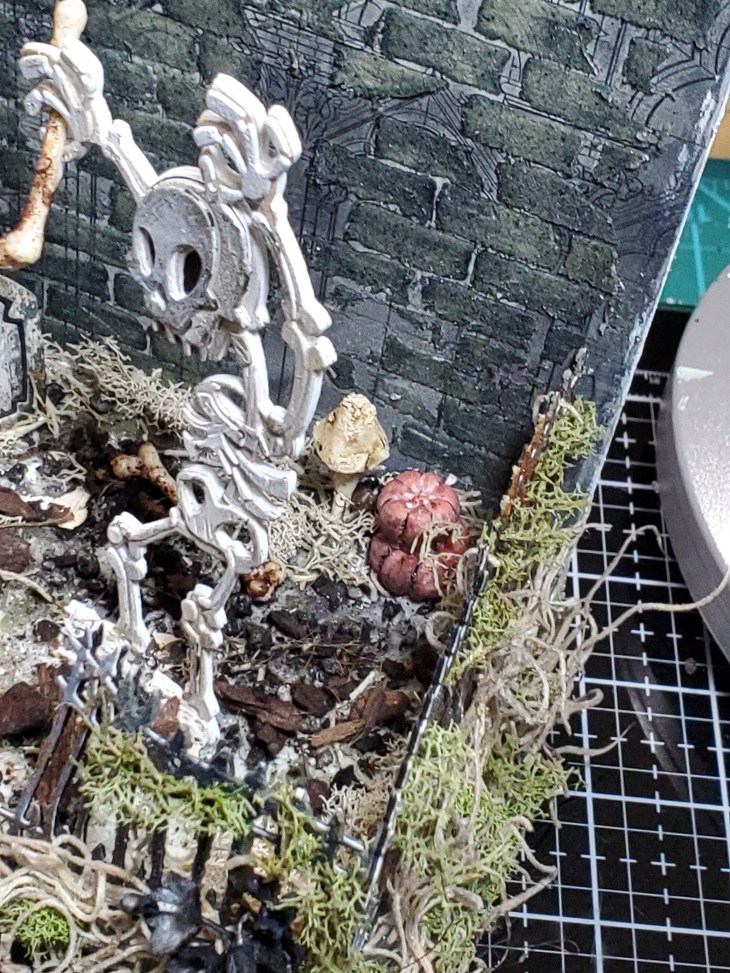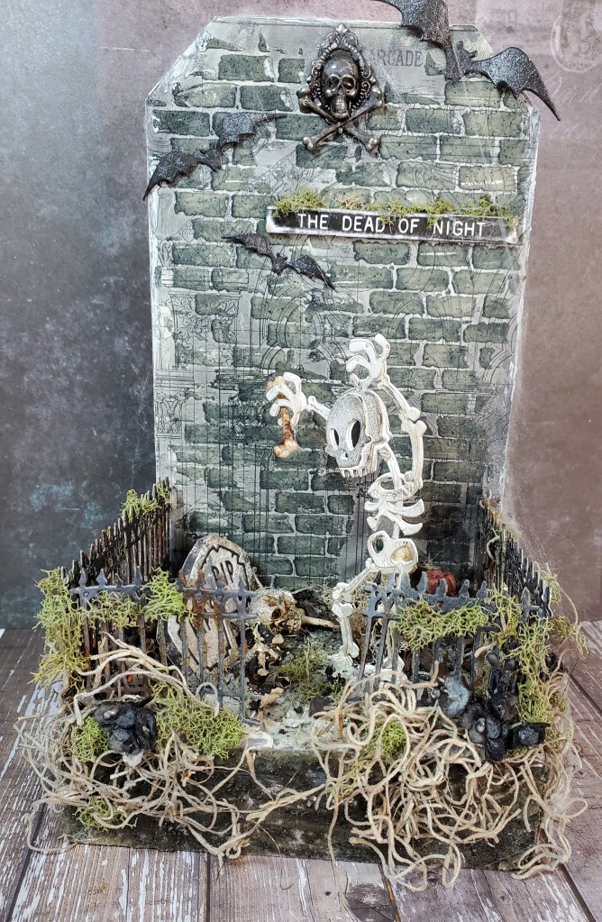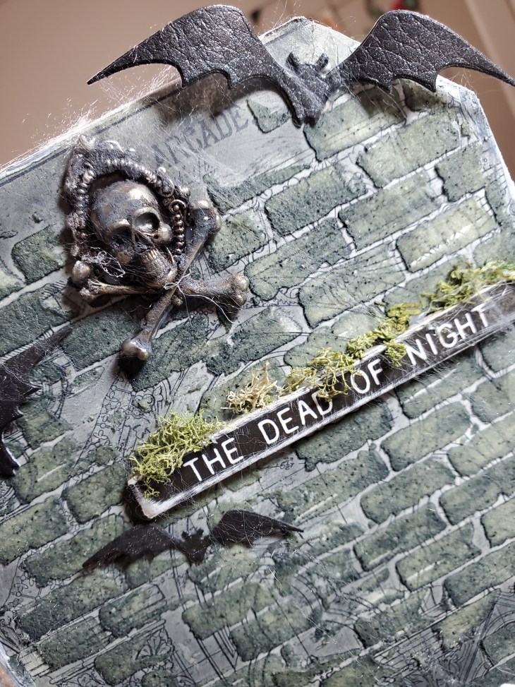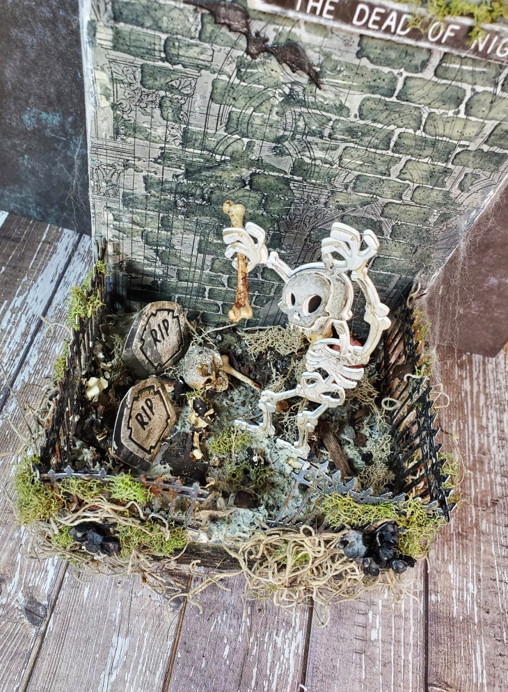I had so much fun decorating the inside of the crypt. With Mr Bones I ended up die cutting the base of it 3 more times to make it a little more thick so that I could glue it in place. I used 2 of the pumpkins from skulls and pumkins, grunged them up using walnut stain crayon. Beside that I put the smallest toad stool which was also grunged with the same crayon. For the bones I put a bit of translucent grit paste. I did end up putting down real dirt and small sticks on the base from my garden. I covered part of the skull with crackle paste and smudged it with walnut stain…lol yes it is definitley my go to color to make something look dirty. The flowers I sprayed with both black soot and pumice stone distress spray. The bats were left overs from a previous make . They were cut from cracked leather cardstock. The skull adornment was covered with grit paste and after it dried I went over it with hickory smoke crayon. I did add some spider webs on parts of the brick work.