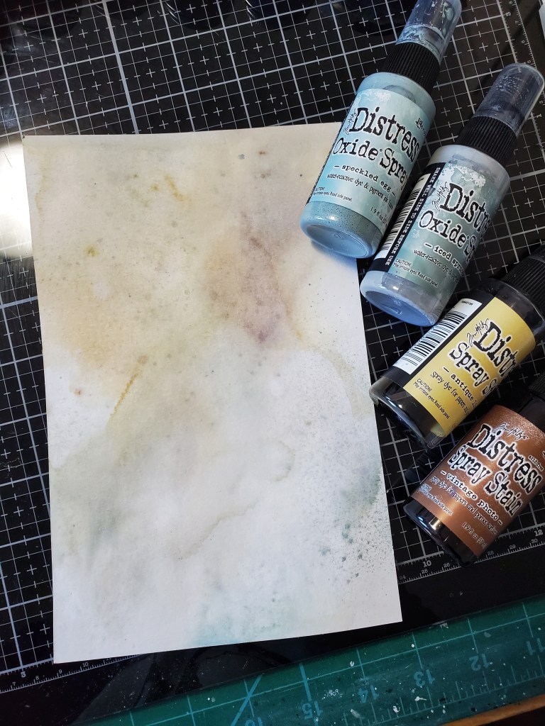 I did a quick background using distress stain sprays, oxides on distress watercolor paper. The colors I used are vintage photo and antique linen spray,iced spruce and speckled egg oxide. I stamped on some images from some of my favourite Stampers anonymous sets using Black archival in, Etcetera CMS302, The Professor CMS395 and Fragments CMS368.