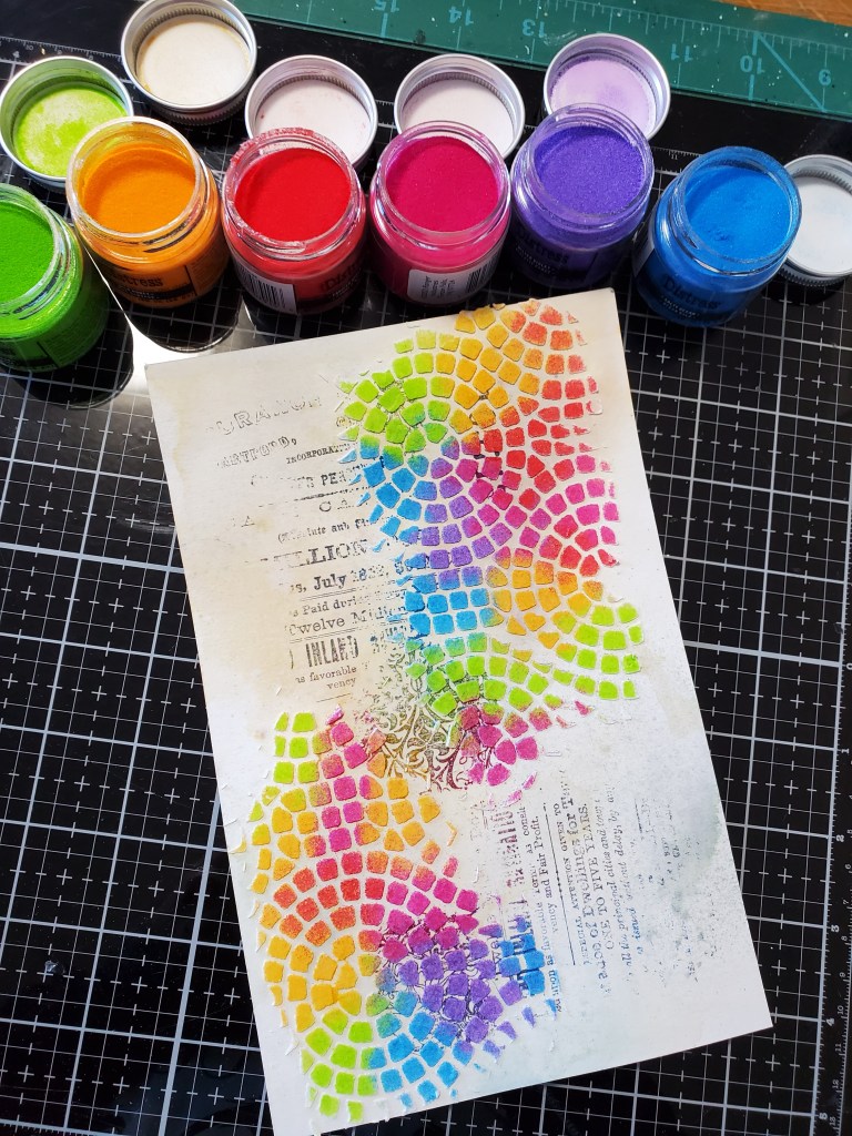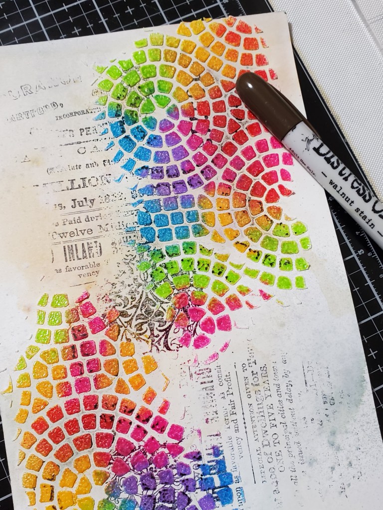 This is the part I had to work quickly on. I had all the distress glaze jars open at the ready. Using the beautiful Mosaic stencil along with texture paste I quickly layered down in sections and sprinkled on the glaze. After I was done I lightly tapped underneath the cardstock to distribute the powder. After I was done the entire panel I went over in sections with walnut stain crayon.