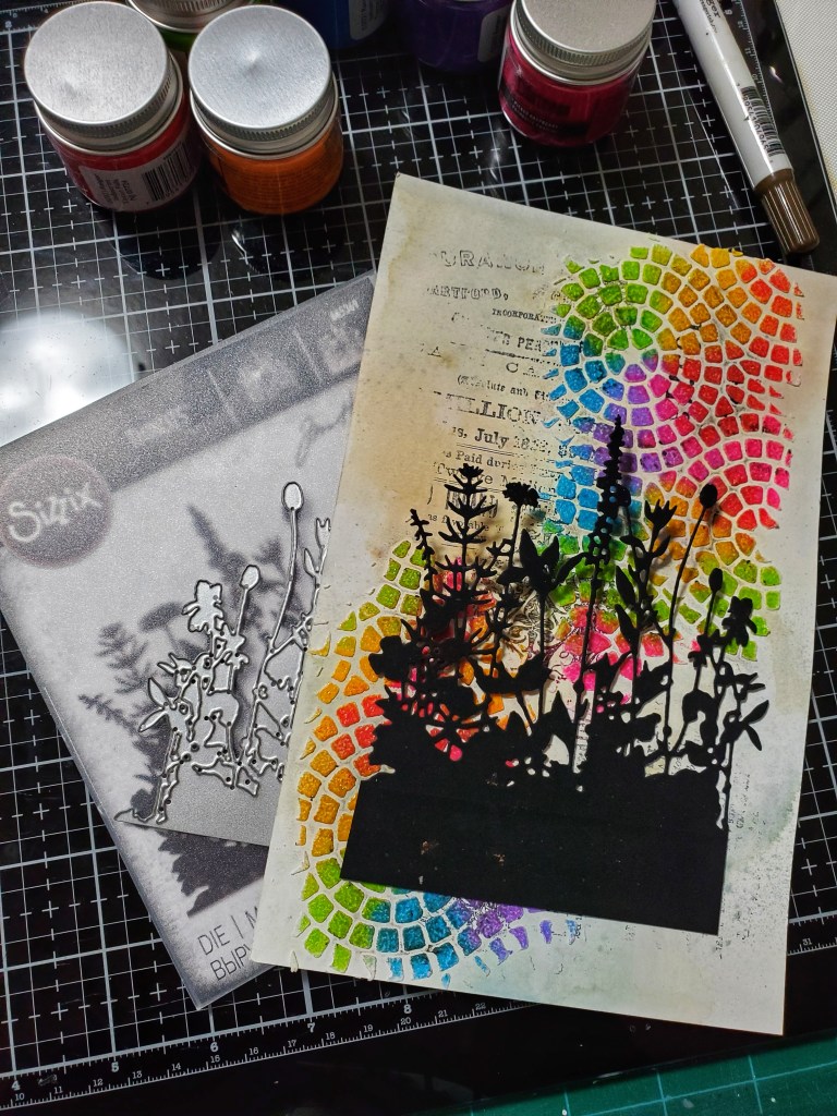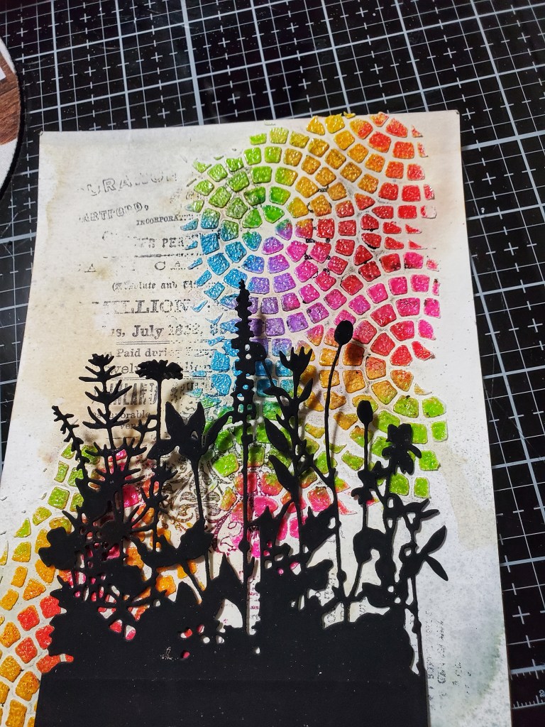 I die cut the Sizzix flower field out of black alcohol cardstock…I love the matte and soft look of this gorgous paper. Who said it it is only for alcohol ink..lol. Took me a while to figure out how I wanted to layer everything. I definitley wanted to keep with the large panel.