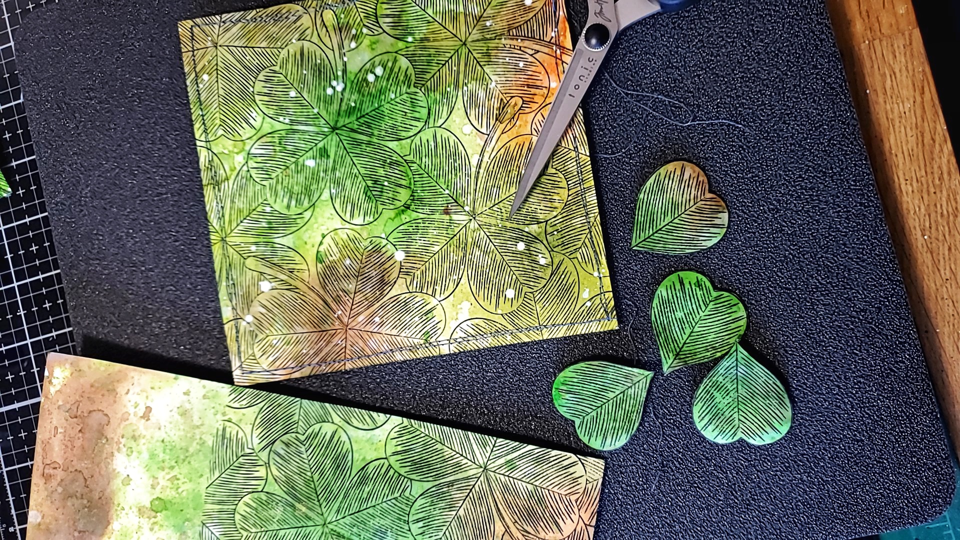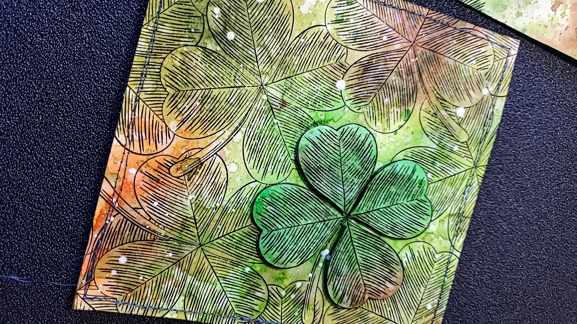 I did some fun stitching on one of the panels and added some white splatters. For the second panel I cut out one of the shamrocks and popped it up on the stitched panel using foam tape.