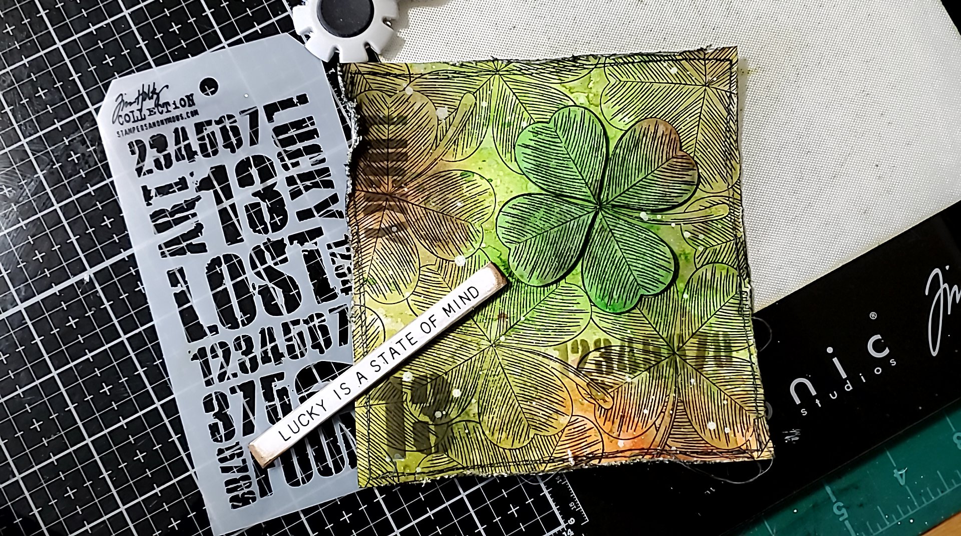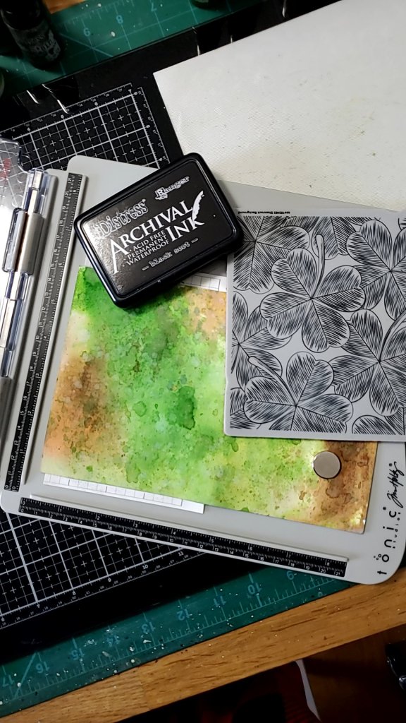 Using archival black ink I stamped the Shamrock background onto both panels.