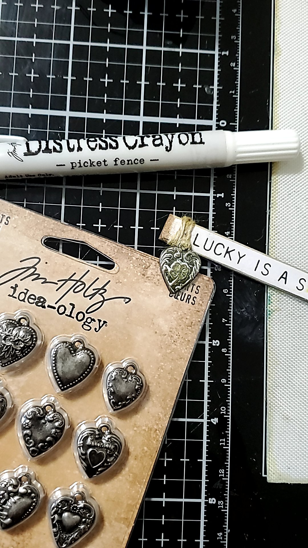 I found that I needed something else on the sentiment and found a heart adornment that had a shamrock on it. Using my white distress crayon I rubbed it on top of the heart.