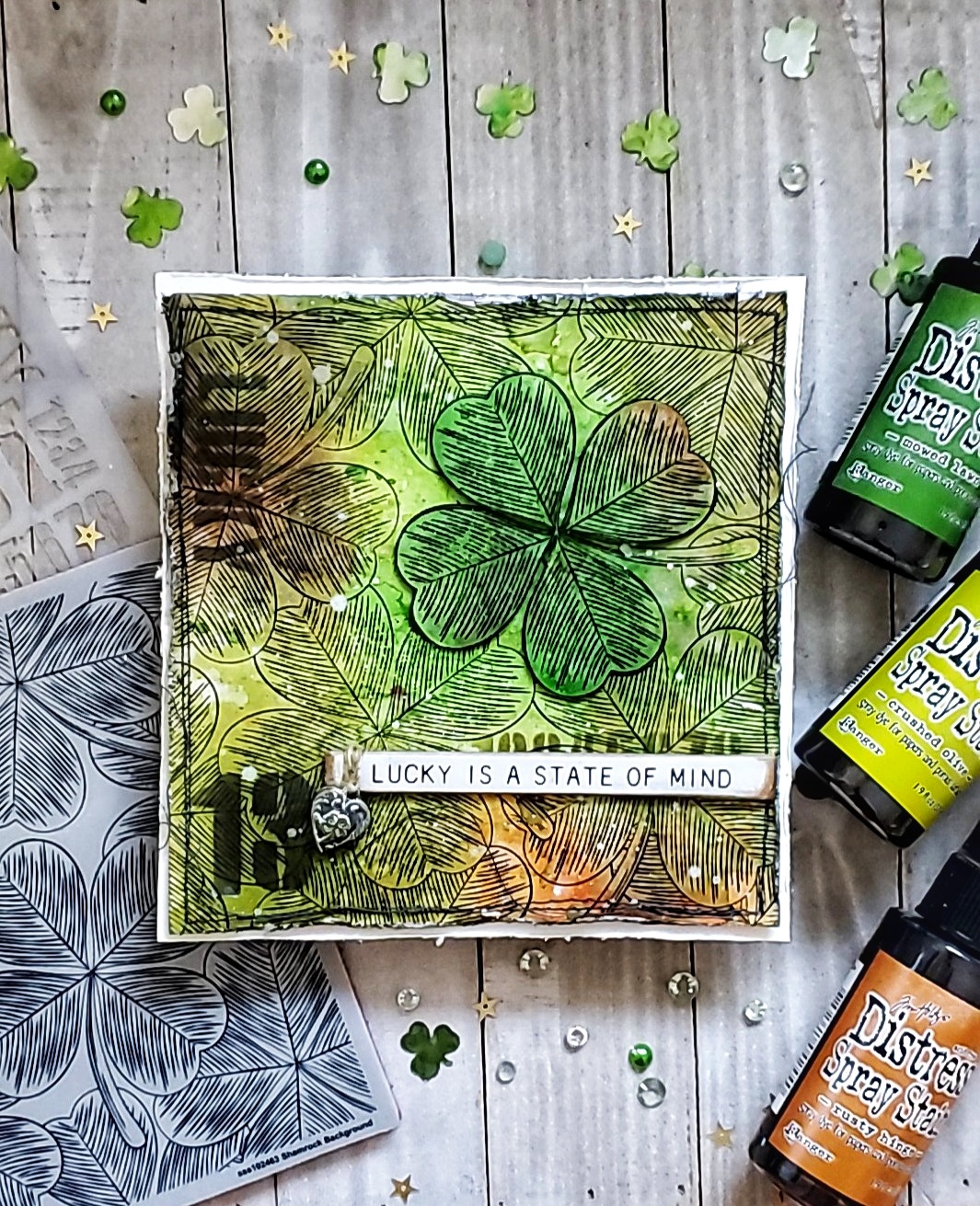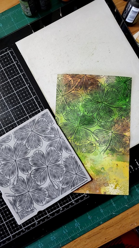 Hello friends, hope you are having an awesome week. Today I am sharing a card I made using the gorgeous SSS Shamrock background. I always love making fun backbgrounds and am trying to get better at showing the colors that I used. Hoping it helps as I get quite a few DM’s on what and how I did the background. I do create in layers, drying in between each one. I made 2 panels using the same colors.